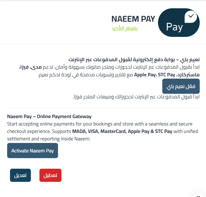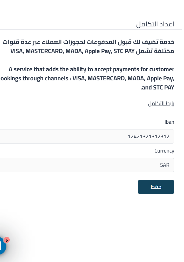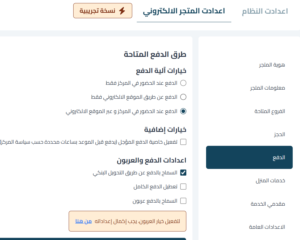 إعدادات الدفع الإلكتروني تتيح لك إعدادات الدفع الإلكتروني التحكم في كيفية ومتى يتم الدفع من قبل العملاء بعد إتمام الحجز. يمكنك تخصيص طرق الدفع، مثل الدفع الإلكتروني أو التحويل البنكي، وتفعيلها بما يتناسب مع احتياجات عملك. من المهم إعداد هذه الخيارات ...